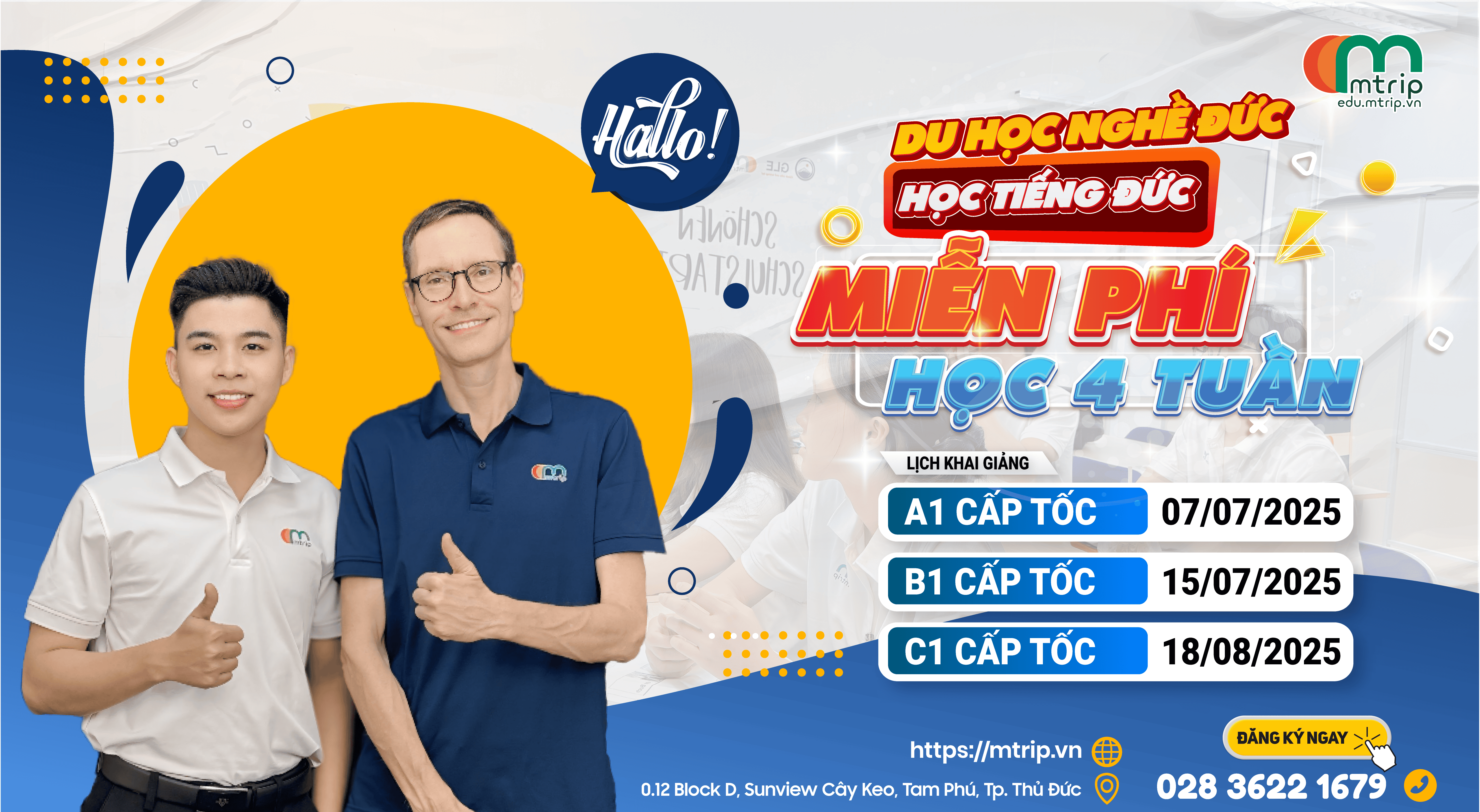 Đừng bỏ lỡ cơ hội để bắt đầu hành trình chinh phục tiếng Đức ngay hôm nay! Đăng ký ngay để giữ chỗ cho khóa học của bạn và trở thành một phần của cộng đồng học viên tại Mtrip. Chúng tôi luôn đồng hành cùng bạn trên con đường học tập và phát triển ngôn ngữ!