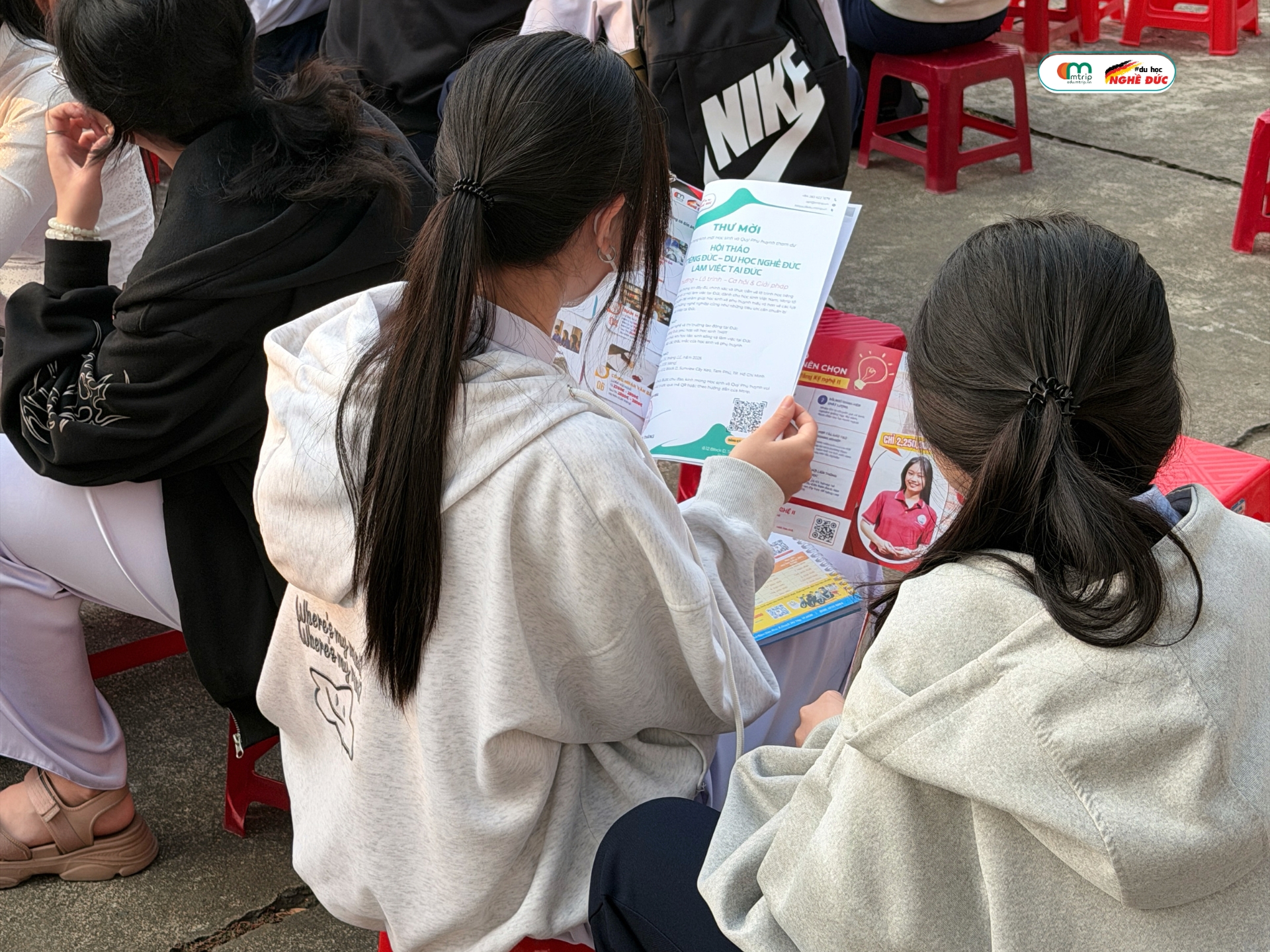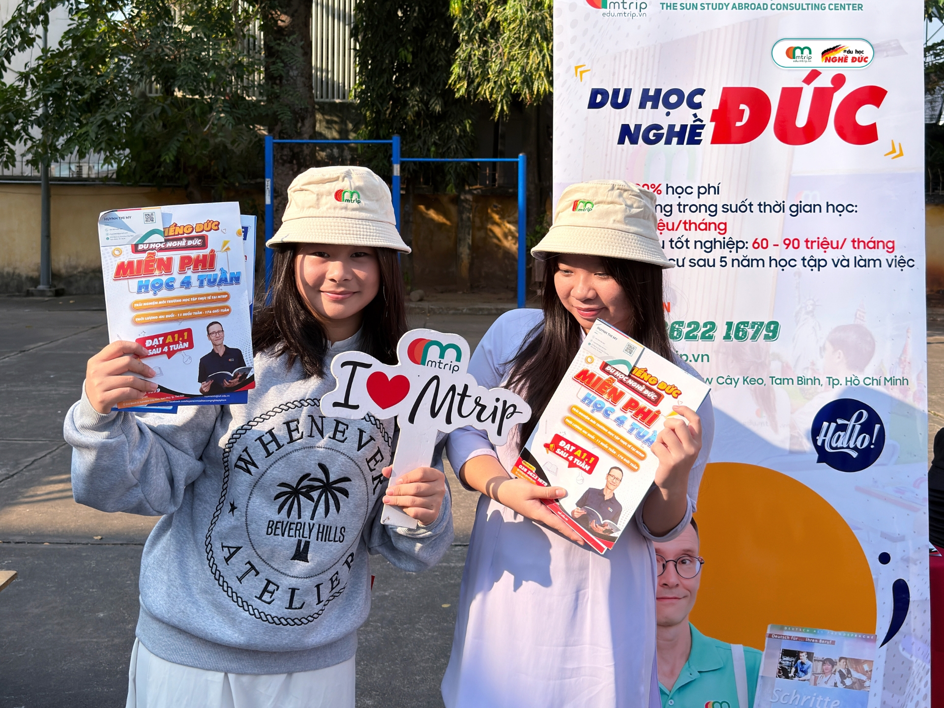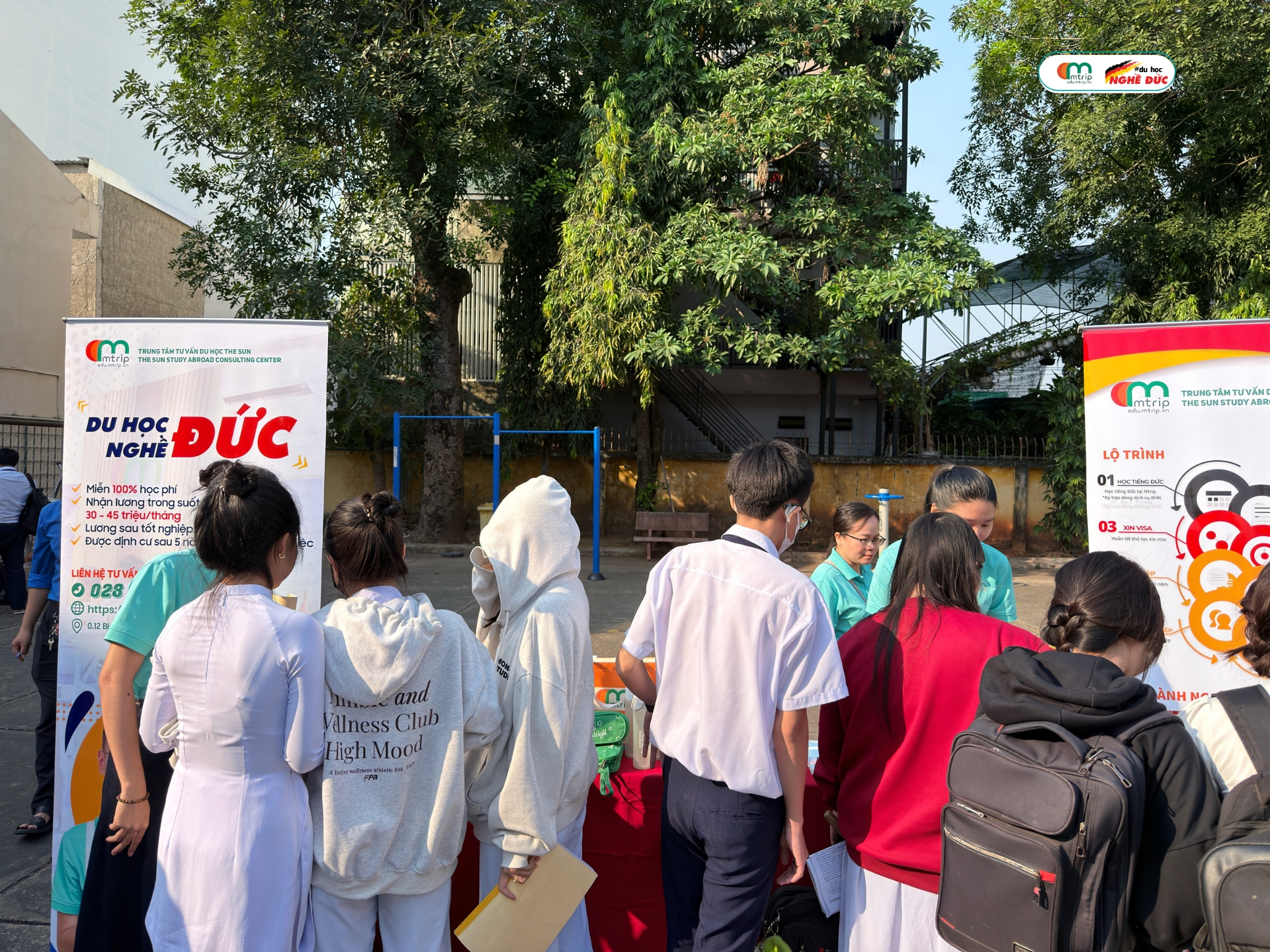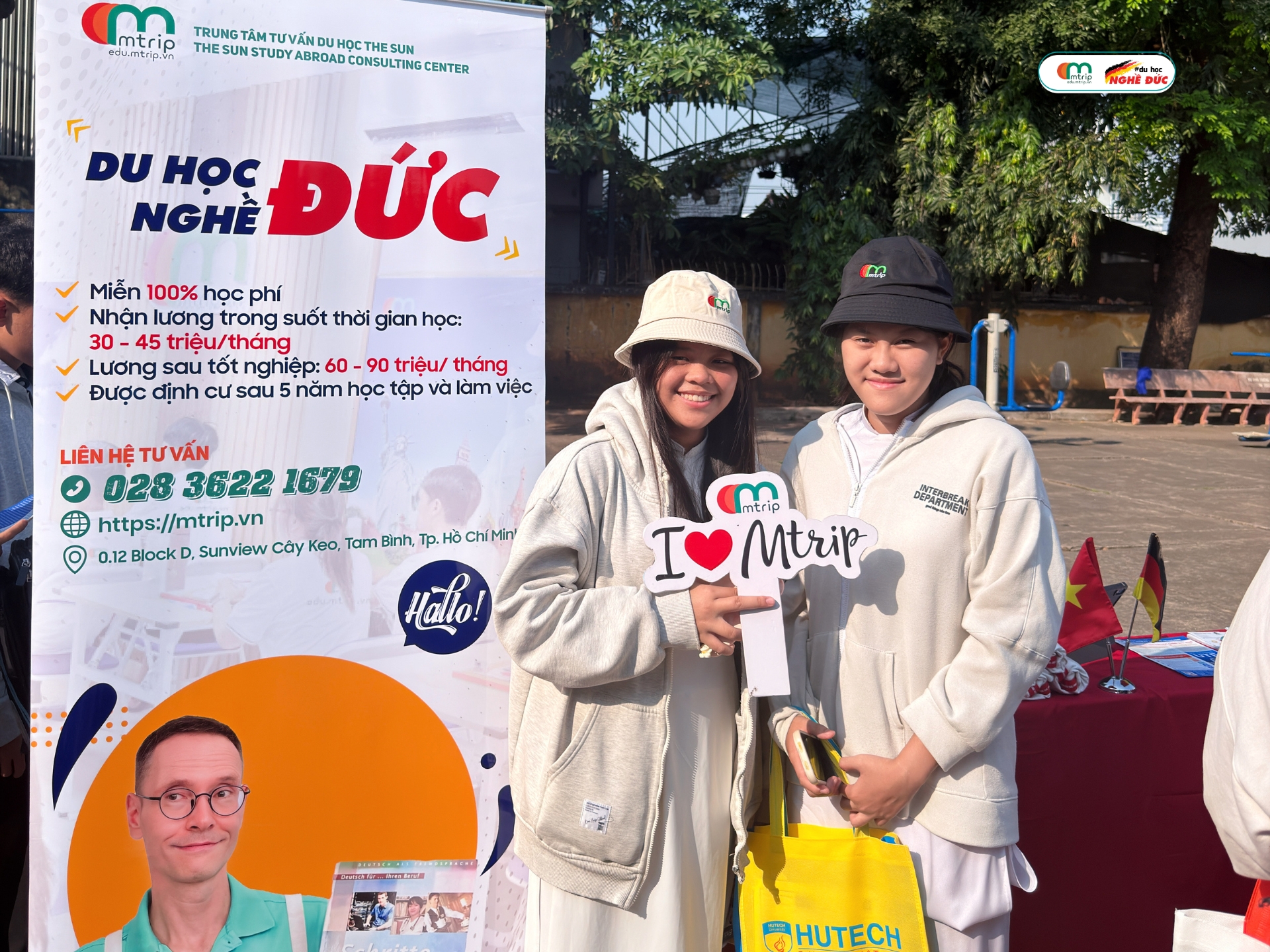 Tại khu vực tư vấn, đội ngũ Mtrip đã trực tiếp trao đổi, giải đáp thắc mắc của các bạn học sinh về điều kiện tham gia chương trình du học nghề Đức, yêu cầu trình độ tiếng Đức, thời gian chuẩn bị hồ sơ cũng như cơ hội làm việc và phát triển nghề nghiệp sau khi hoàn thành chương trình đào tạo. Nhiều bạn học sinh thể hiện sự quan tâm nghiêm túc khi đặt câu hỏi cụ thể về chi phí, lộ trình học tiếng Đức và các ngành nghề phù hợp với năng lực cá nhân.